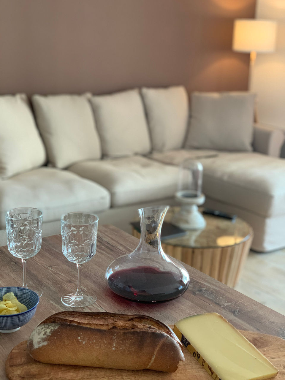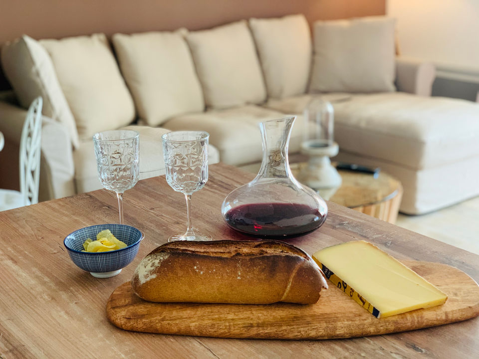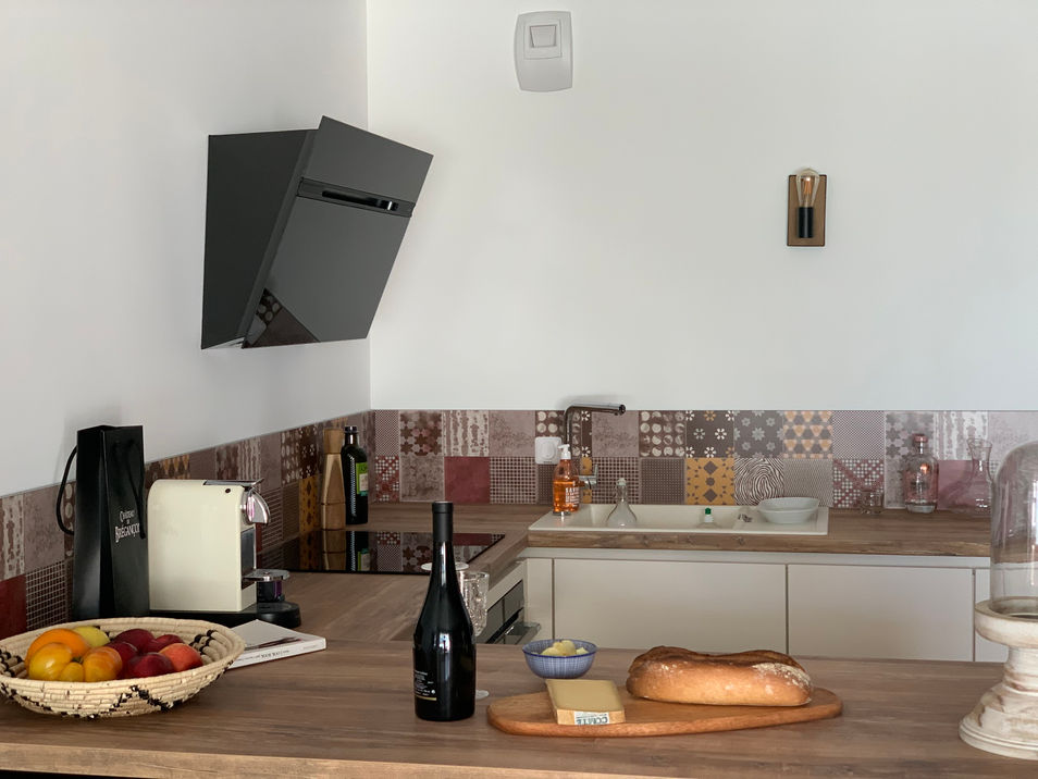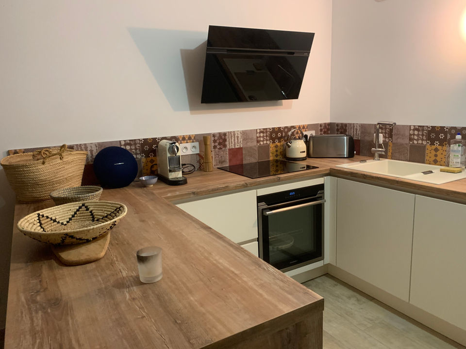 Cuisine entièrement équipée avec cave à vin et machine Nespresso, table pour 4 à 6 personnes, canapé confortable avec table basse, écran plat et enceinte Bluetooth pour des moments de détente.